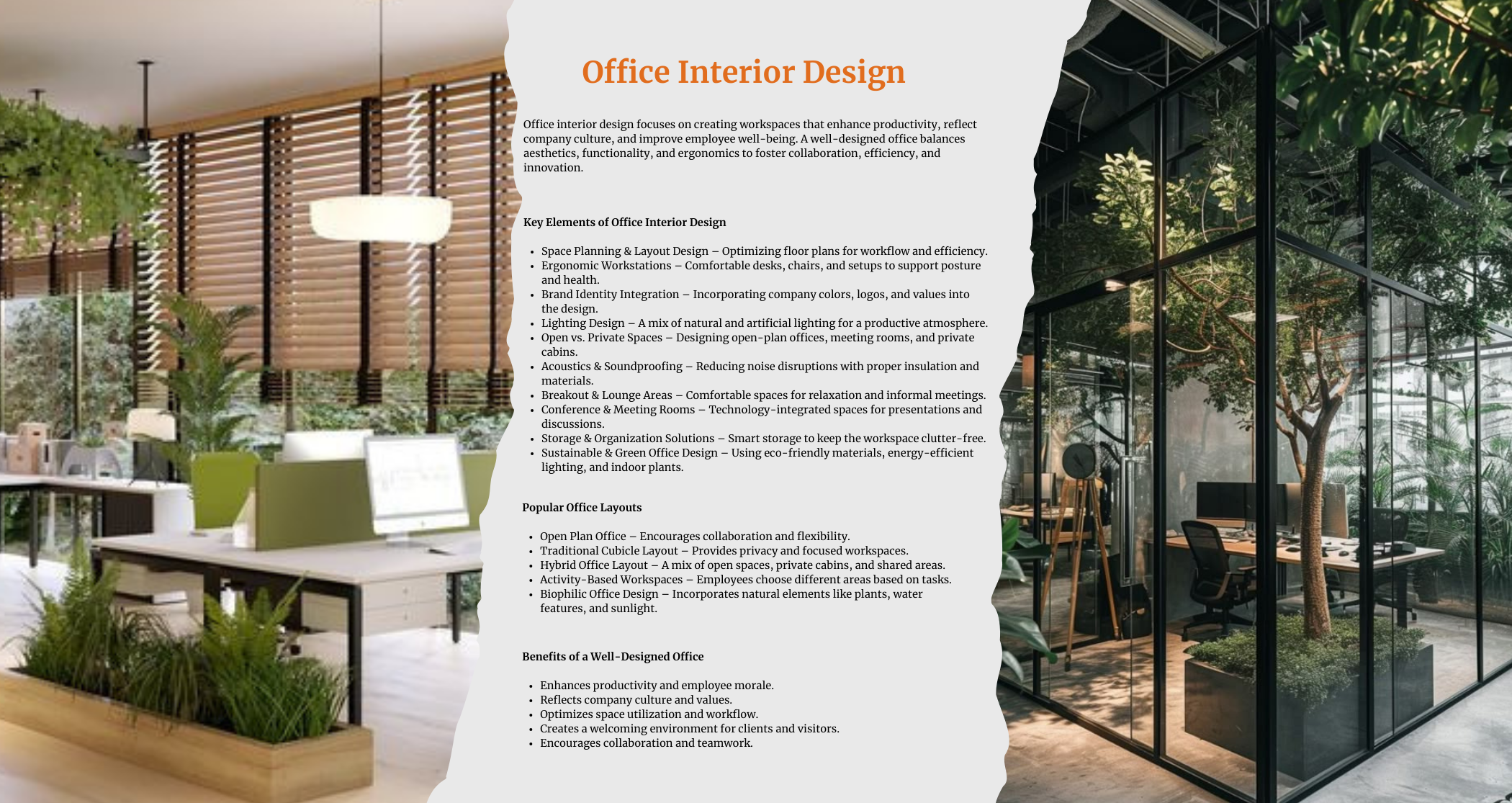 To deliver innovative, high-quality interior solutions that enhance the way people live, work, and interact with their surroundings.